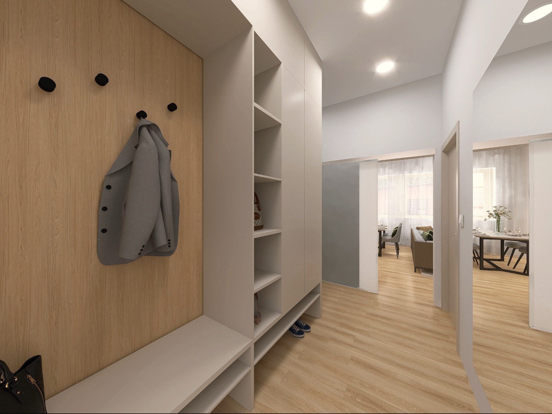 V koupelně, na WC a v technické místnosti je moderní dlažba v dekoru béžového kamene a dřevěných lamel. V obytných pokojích a na chodbě je kvalitní vinylová podlaha. Byt je kompletně osazen stropním osvětlením.