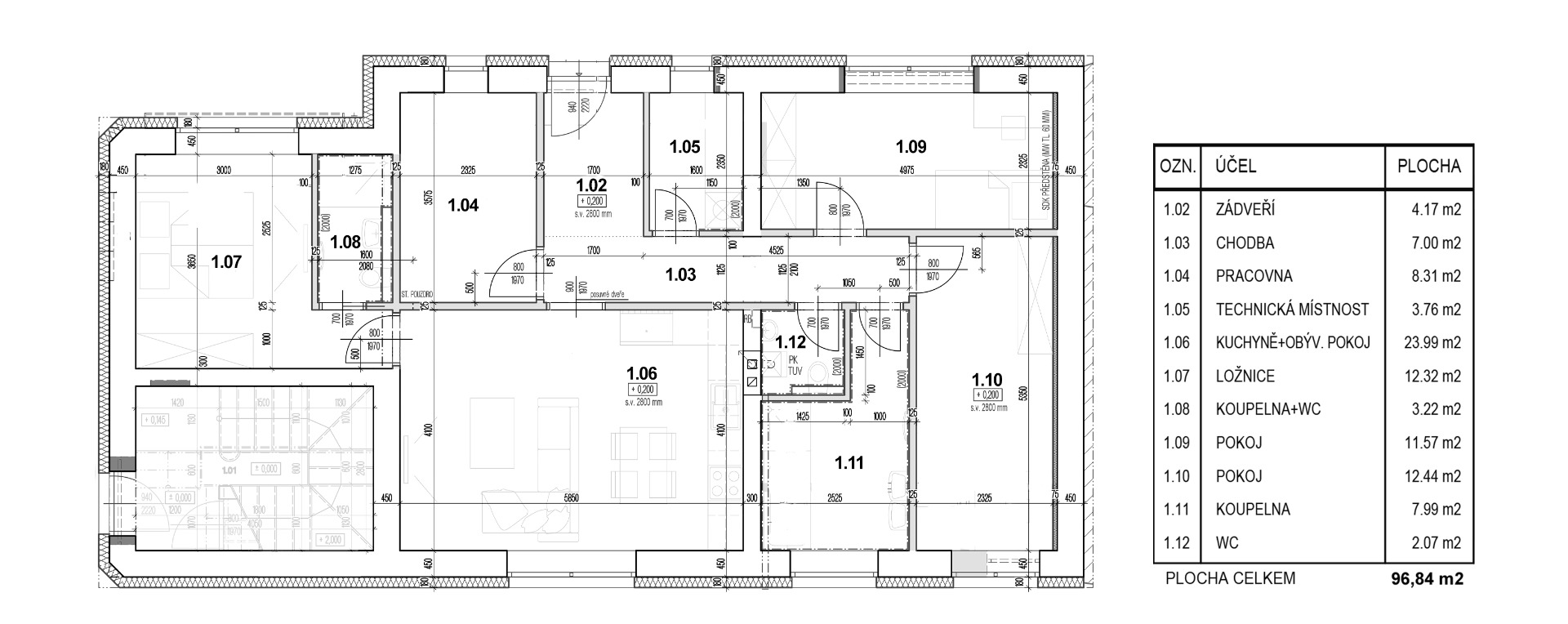 Nadstandardně řešený byt 5+KK v přízemí o celkové rozloze 96.84 m2 se dvěma koupelnami je jako stvořený pro pohodový rodinný život.