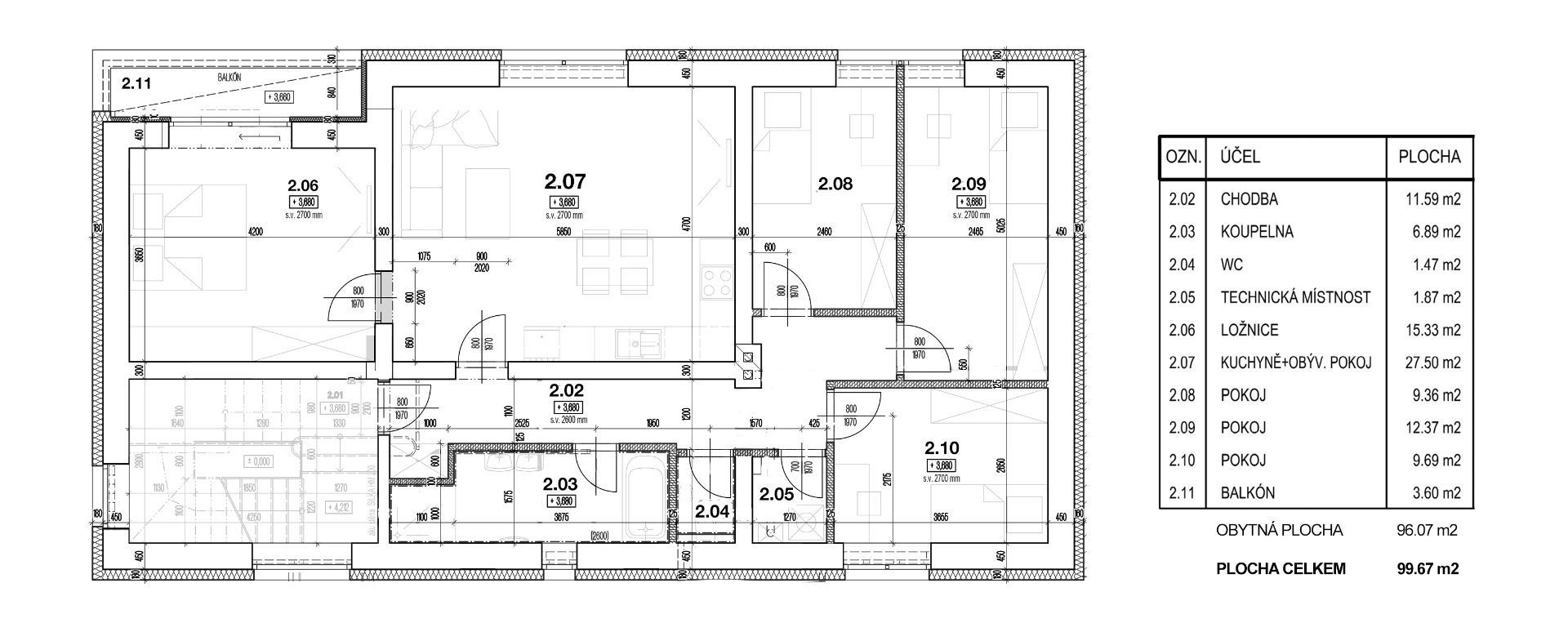 Nadstandardně řešený byt 5+KK v 1. patře o celkové rozloze 99.67 m2 s balkonem.